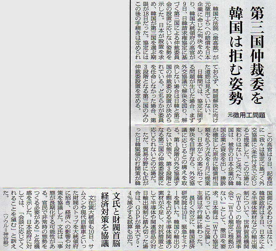本日は朝日新聞朝刊から、「第三国仲裁委を 韓国は拒む姿勢(2019年7月11日版 [649420号] 3面)」の記事をオススメします。