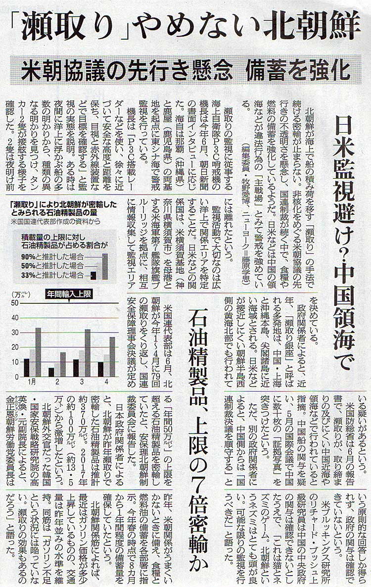 2019.8.18 スタッフ注目記事 カテゴリー: ピックアップ 本日は朝日新聞朝刊から、「『瀬取り』やめない北朝鮮(2019年8月18日版 [649456号] 4面)」の記事をオススメします。 2019年8月18日