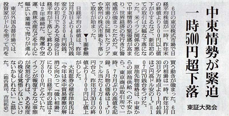 2020.1.7 スタッフ注目記事 カテゴリー: ピックアップ 本日は朝日新聞朝刊から、「中東情勢が緊迫 一時500円超下落(2020年1月7日版 [649593号] 3面)」の記事をオススメします。 2020年1月7日