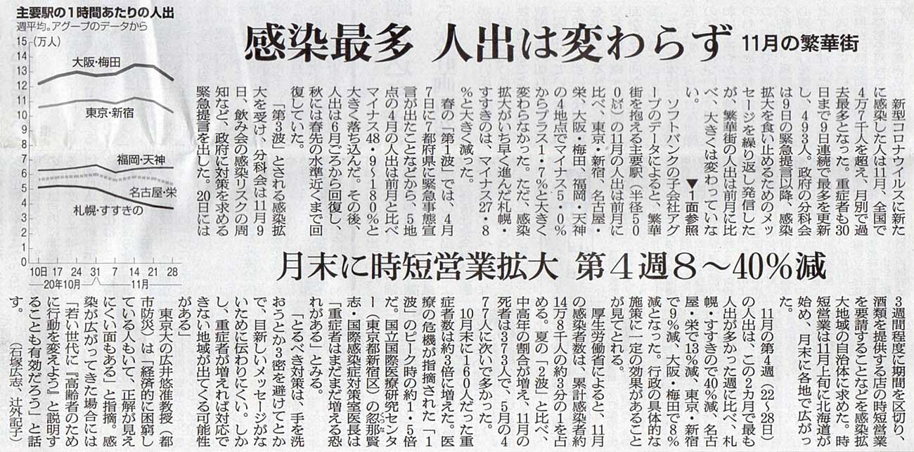 本日は朝日新聞朝刊から、「感染最多 人手は変わらず – 11月の繁華街(2020年12月2日版 [49913] 3面)」の記事をオススメします。