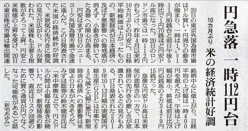 2020.2.21 スタッフ注目記事 カテゴリー: ピックアップ 本日は朝日新聞朝刊から、「円急落 一時112円台(2020年2月21日版 [649637号] 7面)」の記事をオススメします。 2020年2月21日