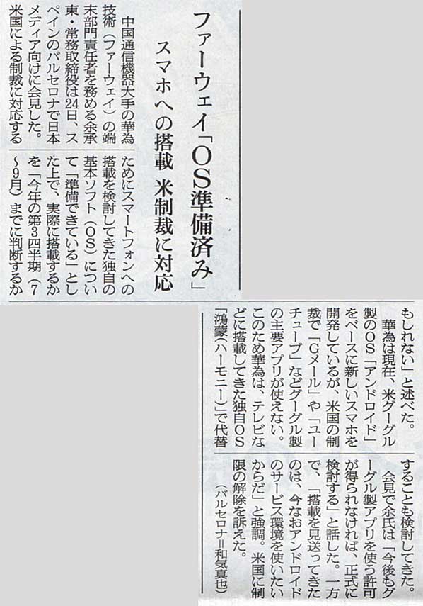 本日は朝日新聞朝刊から、「ファーウェイ『OS準備済み』(2020年2月26日版 [649642号] 7面)」の記事をオススメします。