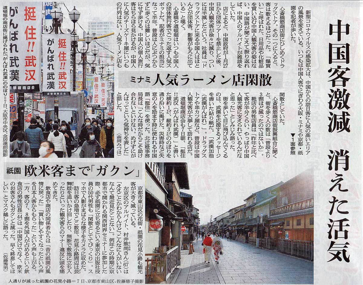 2020.2.9 スタッフ注目記事 カテゴリー: ピックアップ 本日は朝日新聞朝刊から、「中国客減少 消えた活気(2020年2月9日版 [649626号] 27面)」の記事をオススメします。 2020年2月9日