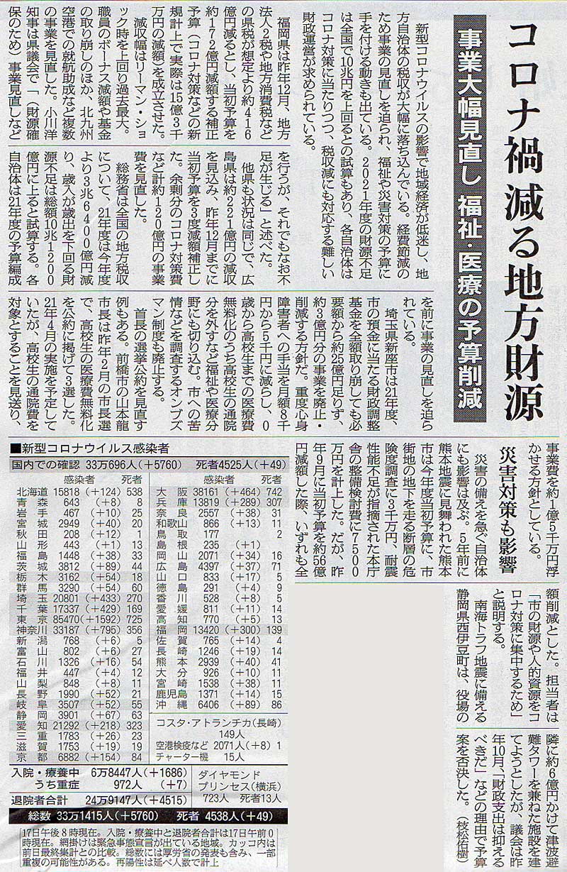 2021.1.18 スタッフ注目記事 カテゴリー: ピックアップ 本日は朝日新聞朝刊から、「コロナ禍 減る地方財源(2021年01月18日版 [49958] 34面)」の記事をオススメします。 2021年1月18日