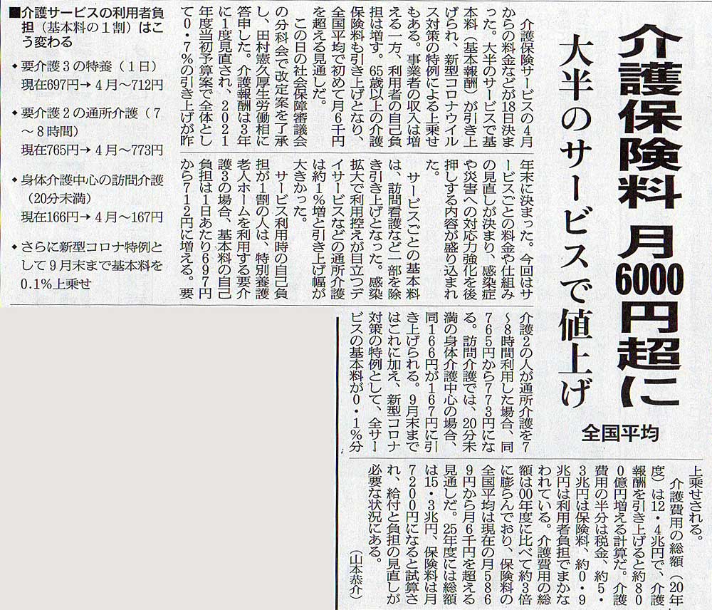 2021.1.19 スタッフ注目記事 カテゴリー: ピックアップ 本日は朝日新聞朝刊から、「介護保険料 月6000円超に(2021年01月19日版 [49959] 3面)」の記事をオススメします。 2021年1月19日