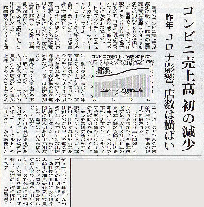 2021.1.21 スタッフ注目記事 カテゴリー: ピックアップ 本日は朝日新聞朝刊から、「コンビニ売上 初の減少(2021年01月21日版 [49961] 7面)」の記事をオススメします。 2021年1月21日