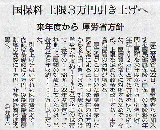 2021.10.23 スタッフ注目記事 カテゴリー: ピックアップ 本日は朝日新聞朝刊から、「国保料 上限3万円引き上げへ(2021年10月23日版 [50227] 4面)」の記事をオススメします。 2021年10月23日