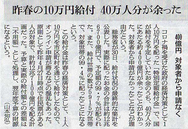 2021.5.1 スタッフ注目記事 カテゴリー: ピックアップ 本日は朝日新聞朝刊から、「昨春の10万円給付 40万人分余った(2021年05月01日版 [50058] 5面)」の記事をオススメします。 2021年5月1日