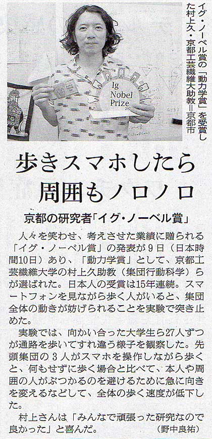 本日は朝日新聞朝刊から、「歩きスマホしたら周囲もノロノロ – 京都の研究者『イグ・ノーベル賞』(2021年09月11日版 [50187] 36面)」の記事をオススメします。