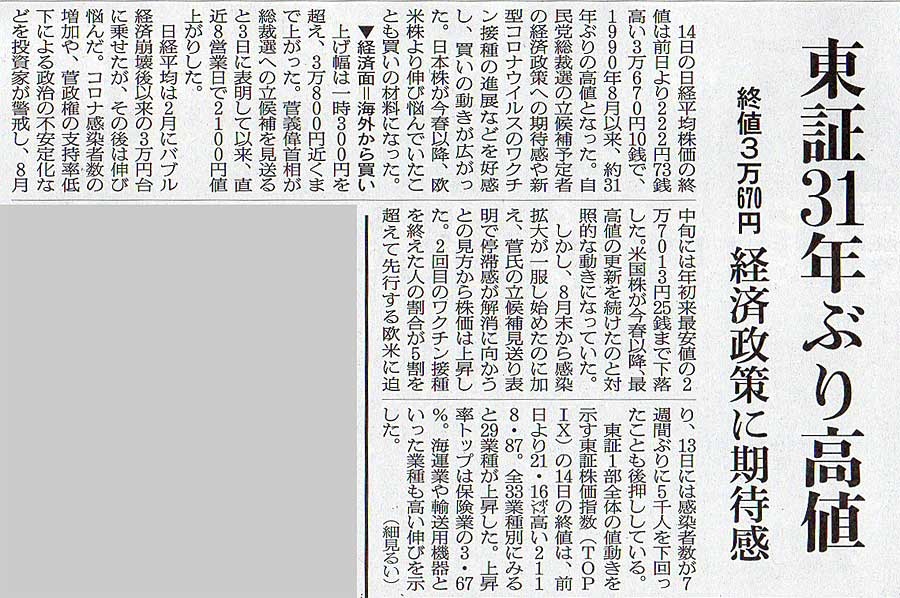 2021.9.15 スタッフ注目記事 カテゴリー: ピックアップ 本日は朝日新聞朝刊から、「東証31年ぶり高値(2021年09月15日版 [50190] 3面)」の記事をオススメします。 2021年9月15日