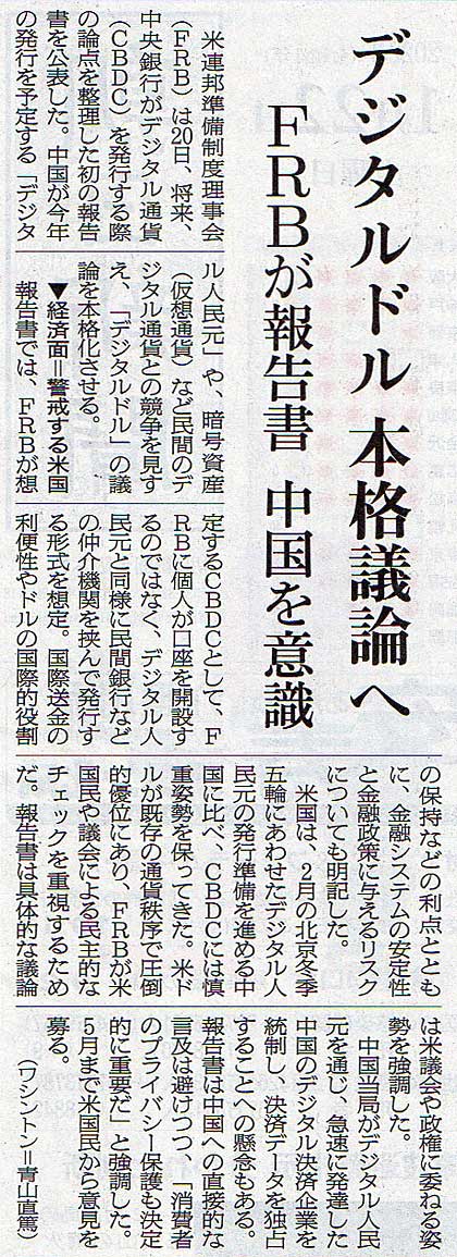 2022.1.22 スタッフ注目記事 カテゴリー: ピックアップ 本日は朝日新聞朝刊から、「デジタルドル 本格議論へ(2022年1月22日版 [50315] 2面)」の記事をオススメします。 2022年1月22日