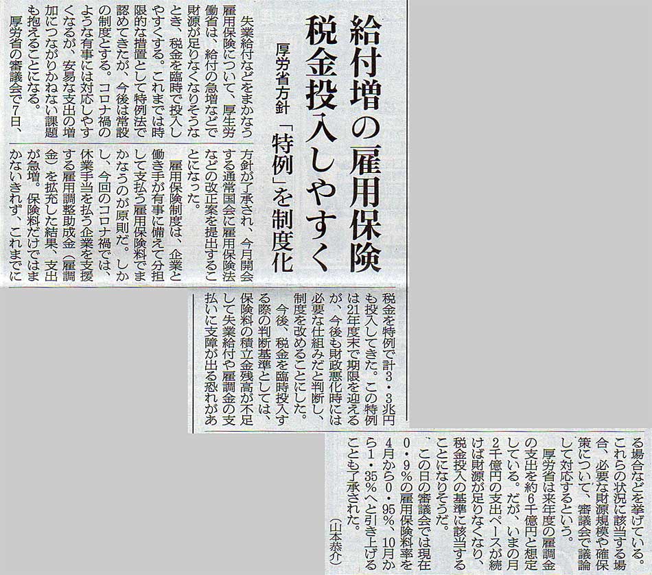 2022.1.8 スタッフ注目記事 カテゴリー: ピックアップ 本日は朝日新聞朝刊から、「給付増の雇用保険 税金投入しやすく(2022年1月8日版 [50301] 7面)」の記事をオススメします。 2022年1月8日