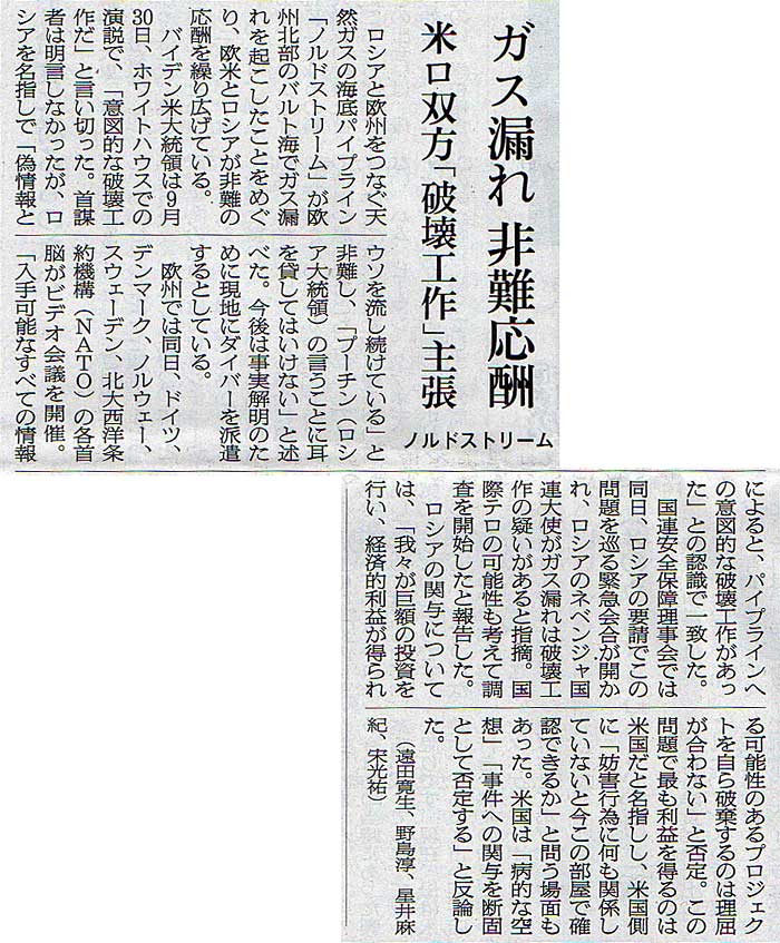 本日は朝日新聞朝刊から、「ガス漏れ 非難応酬 – 米ロ双方『破壊工作』主張(2022年10月2日版 [50560] 5面)」の記事をオススメします。