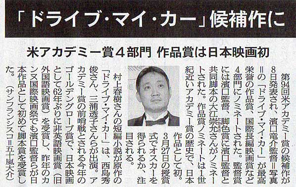 2022.2.9 スタッフ注目記事 カテゴリー: ピックアップ 本日は朝日新聞朝刊から、「『ドライブ・マイカー』候補作に(2022年2月9日版 [50333] 26面)」の記事をオススメします。 2022年2月9日