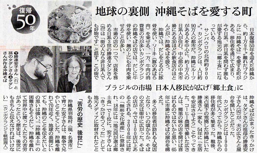 本日は朝日新聞朝刊から、「復帰50年」の「地球の裏側 沖縄そばを愛する町(2022年5月16日版 [503525] 4面)」の記事をオススメします。