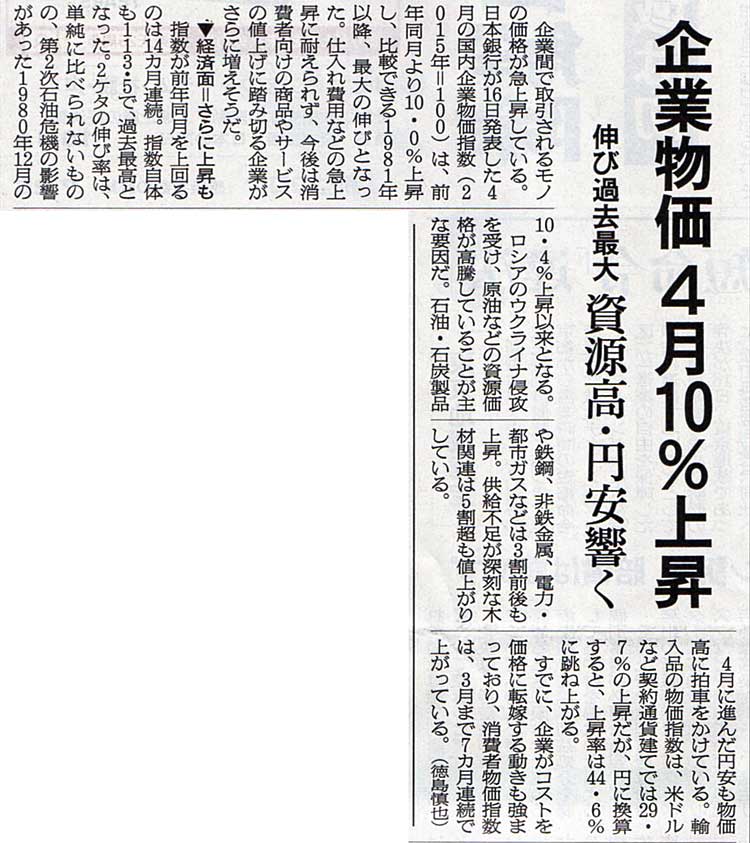 2022.5.17 スタッフ注目記事 カテゴリー: ピックアップ 本日は朝日新聞朝刊から、「企業物価 4月10%上昇(2022年5月17日版 [503526] 2面)」の記事をオススメします。 2022年5月17日
