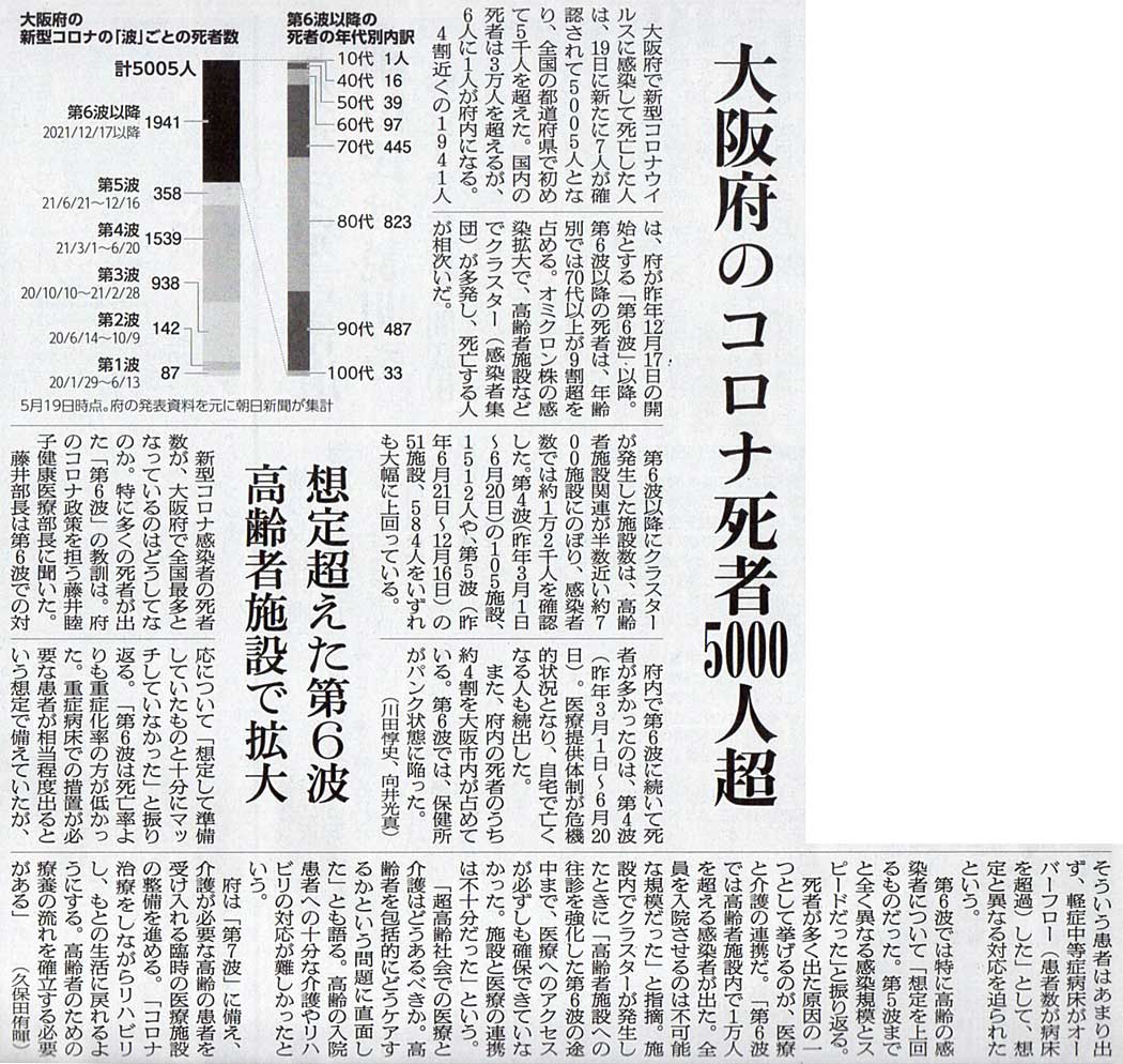 2022.5.20 スタッフ注目記事 カテゴリー: ピックアップ 本日は朝日新聞朝刊から、「大阪府のコロナ死者5000人超(2022年5月20日版 [503529] 28面)」の記事をオススメします。 2022年5月20日