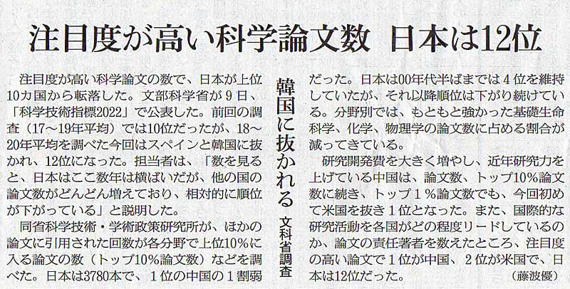 2022.8.10 スタッフ注目記事 カテゴリー: ピックアップ 本日は朝日新聞朝刊から、「注目度が高い科学論文数 日本は12位(2022年8月10日版 [503608] 4面)」の記事をオススメします。 2022年8月10日