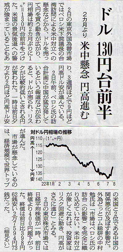 2022.8.3 スタッフ注目記事 カテゴリー: ピックアップ 本日は朝日新聞朝刊から、「ドル 130円台前半(2022年8月3日版 [503602] 3面)」の記事をオススメします。 2022年8月3日