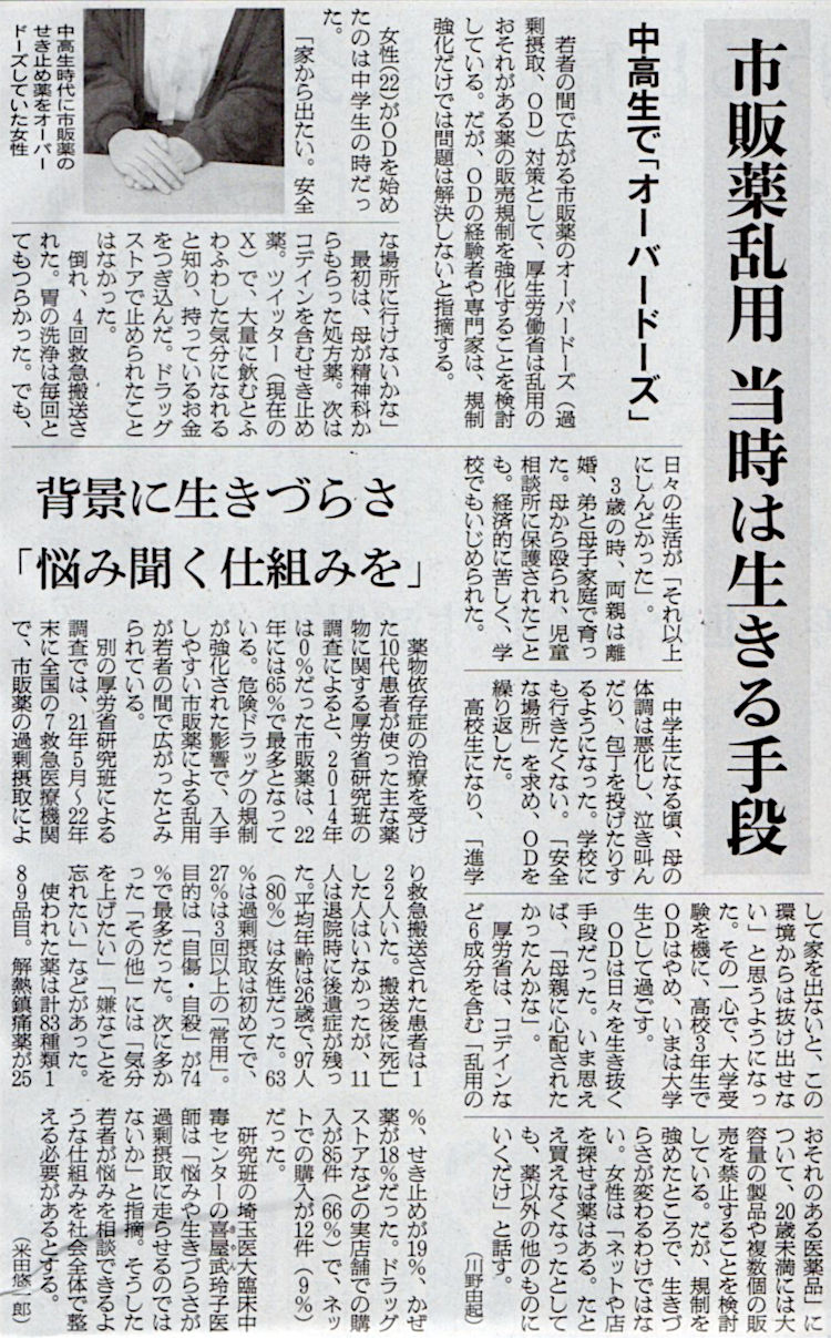 2023.12.3 スタッフ注目記事 カテゴリー: ピックアップ 本日は朝日新聞朝刊から、「市販薬乱用 当時は生きる手段(2023年12月3日版 [50973] 30面)」の記事をオススメします. 2023年12月3日