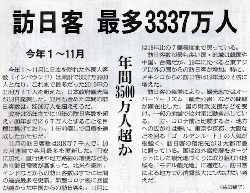 2024.12.19スタッフ注目記事 カテゴリー: ピックアップ 本日は朝日新聞朝刊から、「訪日客 最多3337万人(2024年12月19日版 [51342] 6面)」の記事をオススメします. 2024年12月19日
