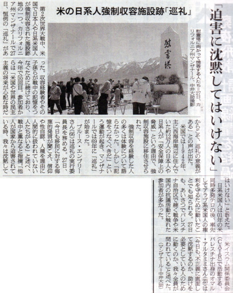 本日は朝日新聞朝刊から、「『迫害に沈黙してはいけない』 – 米の日系人強制収容施設跡『巡礼』(2024年4月29日版 [51116] 4面)」の記事をオススメします.