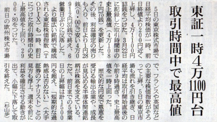 2024.7.6スタッフ注目記事 カテゴリー: ピックアップ 本日は朝日新聞朝刊から、「東証一時4万1100円台 取引時間中で最高値(2024年7月6日版 [51182] 3面)」の記事をオススメします. 2024年7月6日