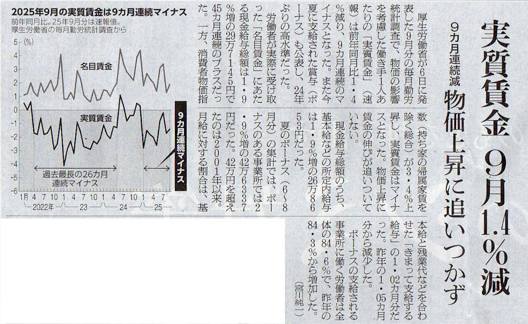2025.11.7スタッフ注目記事 カテゴリー: ピックアップ 本日は朝日新聞朝刊から、「実質賃金 9月1.4%減(2025年11月7日版 [51656] 7面)」の記事をオススメします. 2025年11月7日