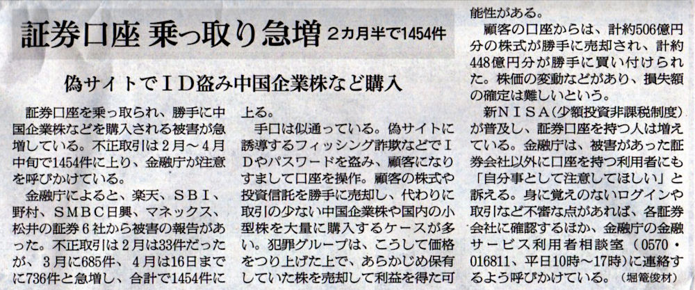 2025.4.19スタッフ注目記事 カテゴリー: ピックアップ 本日は朝日新聞朝刊から、「証券口座 乗っ取り急増(2025年4月19日版 [51460] 6面)」の記事をオススメします. 2025年4月19日