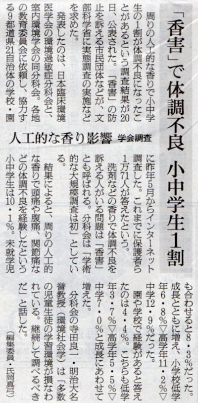 2025.8.22スタッフ注目記事 カテゴリー: ピックアップ 本日は朝日新聞朝刊から、「『香害』で体調不良 小中学生1割(2025年8月22日版 [51580] 25面)」の記事をオススメします. 2025年8月22日