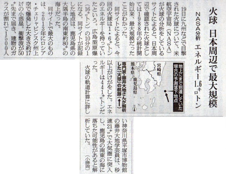 2025.8.24スタッフ注目記事 カテゴリー: ピックアップ 本日は朝日新聞朝刊から、「火球 日本周辺で最大規模(2025年8月24日版 [51582] 28面)」の記事をオススメします. 2025年8月24日