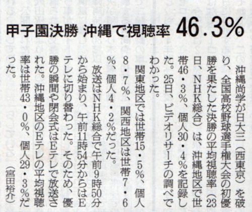 2025.8.26スタッフ注目記事 カテゴリー: ピックアップ 本日は朝日新聞朝刊から、「甲子園決勝 沖縄で視聴率46.3%(2025年8月26日版 [51584] 23面)」の記事をオススメします. 2025年8月26日