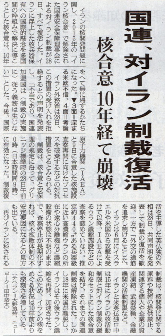 2025.9.29スタッフ注目記事 カテゴリー: ピックアップ 本日は朝日新聞朝刊から、「国連、対イラン制裁復活(2025年9月29日版 [51618] 1面)」の記事をオススメします. 2025年9月29日