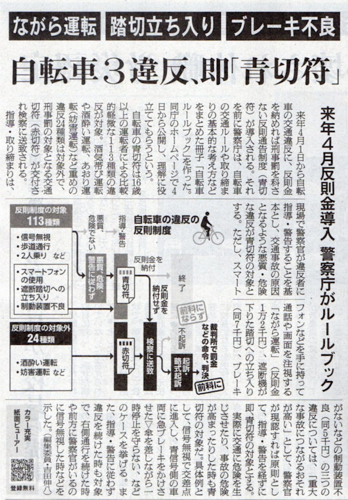 2025.9.5スタッフ注目記事 カテゴリー: ピックアップ 本日は朝日新聞朝刊から、「自転車3違反、即『青切符』(2025年9月5日版 [51595] 26面)」の記事をオススメします. 2025年9月5日