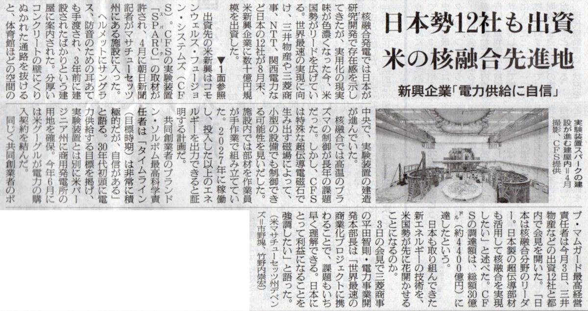 2025.9.7スタッフ注目記事 カテゴリー: ピックアップ 本日は朝日新聞朝刊から、「日本勢12社も出資 米の核融合先進地(2025年9月7日版 [51597] 3面)」の記事をオススメします. 2025年9月7日