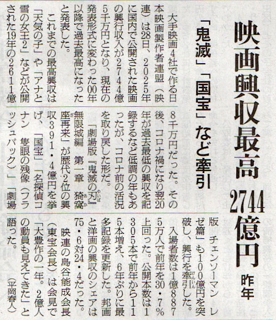 2026.1.29スタッフ注目記事 カテゴリー: ピックアップ 本日は朝日新聞朝刊から、「映画興収最高2744億円(2026年1月29日版 [51735] 25面)」の記事をオススメします. 2026年1月29日