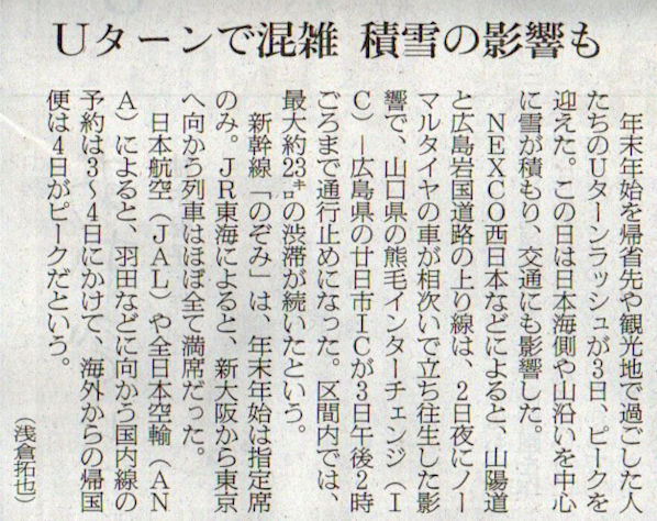 2026.1.4スタッフ注目記事 カテゴリー: ピックアップ 本日は朝日新聞朝刊から、「Uターンで混雑 積雪の影響も(2026年1月4日版 [51710] 28面)」の記事をオススメします. 2026年1月4日
