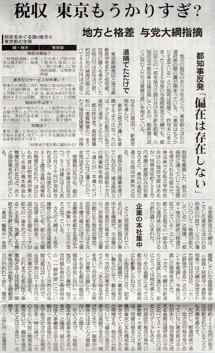 2026.1.6スタッフ注目記事 カテゴリー: ピックアップ 本日は朝日新聞朝刊から、「税収 東京もうかりすぎ?(2026年1月6日版 [51712] 24面)」の記事をオススメします. 2026年1月6日