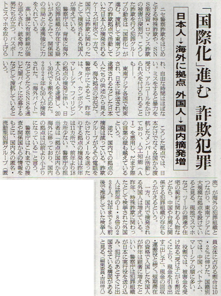 本日は朝日新聞朝刊から、「『国際化』進む 詐欺集団(2026年2月14日版 [51751] 35面)」の記事をオススメします.