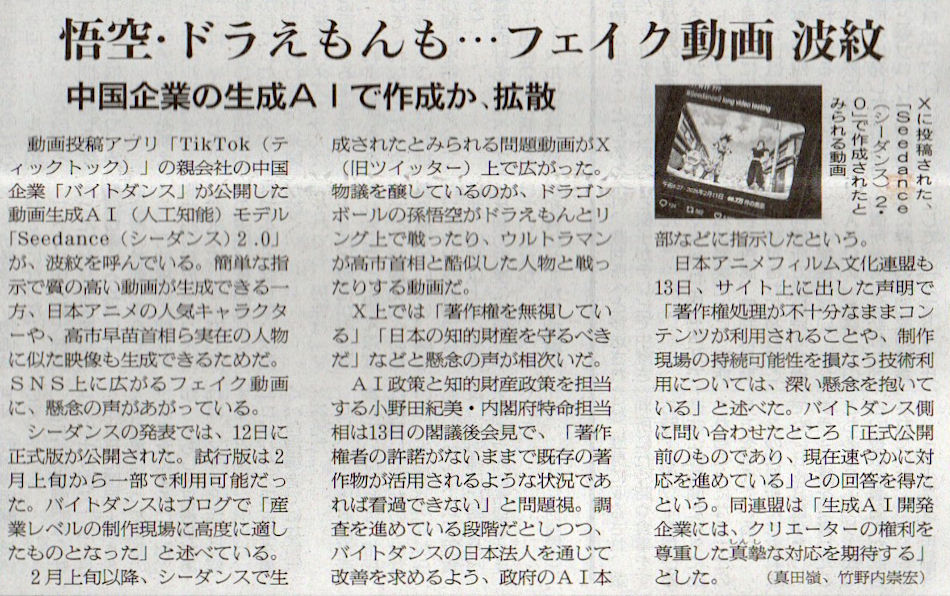 2026.2.15スタッフ注目記事 カテゴリー: ピックアップ 本日は朝日新聞朝刊から、「悟空・ドラえもん…フェイク動画 波紋(2026年2月15日版 [51752] 3面)」の記事をオススメします. 2026年2月15日