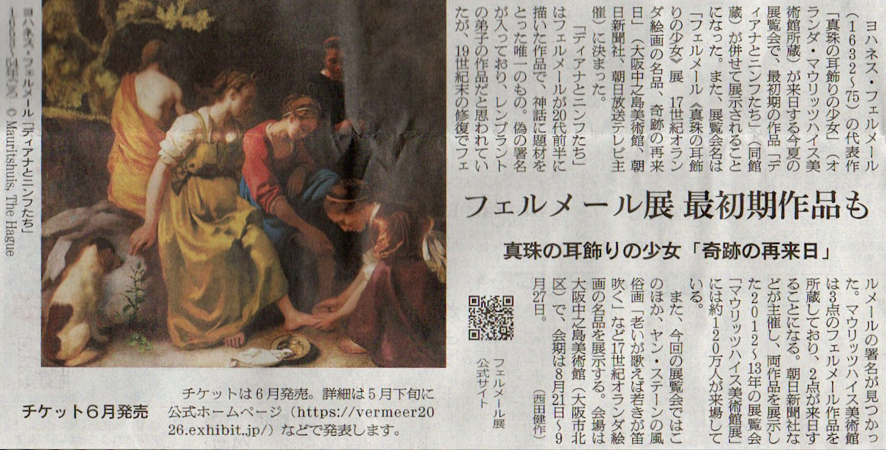 2026.2.26スタッフ注目記事 カテゴリー: ピックアップ 本日は朝日新聞朝刊から、「フェルメール展 最初期作品も(2026年2月26日版 [51761] 33面)」の記事をオススメします. 2026年2月26日
