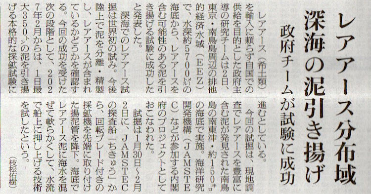 2026.2.3スタッフ注目記事 カテゴリー: ピックアップ 本日は朝日新聞朝刊から、「レアアース分布域 深海の泥引き上げ(2026年2月3日版 [51740] 13面)」の記事をオススメします. 2026年2月3日