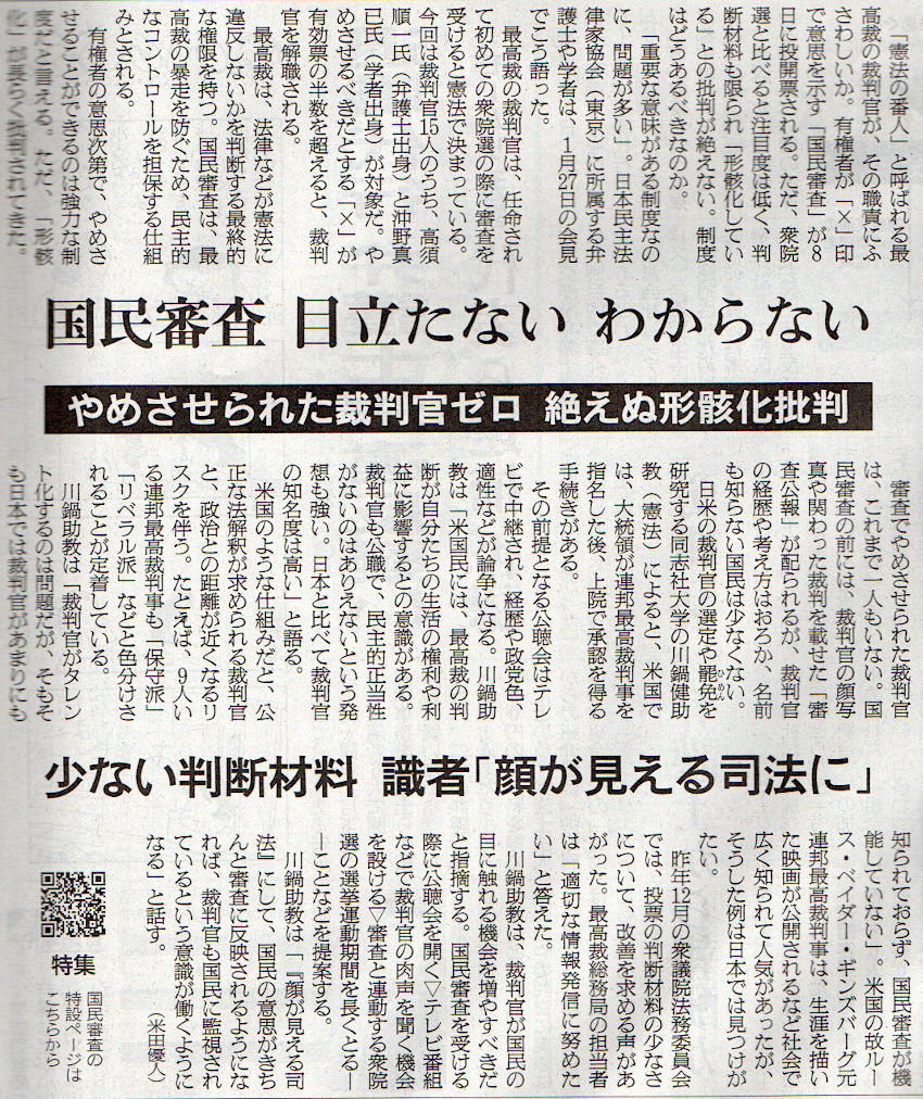 2026.2.4スタッフ注目記事 カテゴリー: ピックアップ 本日は朝日新聞朝刊から、「国民審査 目立たない わからない(2026年2月4日版 [51741] 25面)」の記事をオススメします. 2026年2月4日