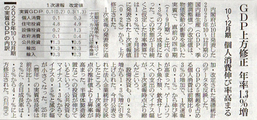 2026.3.11スタッフ注目記事 カテゴリー: ピックアップ 本日は朝日新聞朝刊から、「GDP上方修正 年率1.3%増(2026年3月11日版 [51774] 9面)」の記事をオススメします. 2026年3月11日