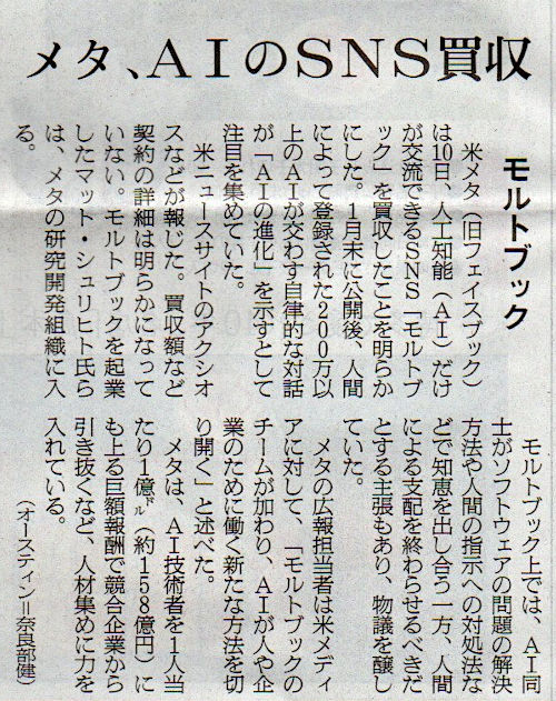 2026.3.12スタッフ注目記事 カテゴリー: ピックアップ 本日は朝日新聞朝刊から、「メタ、AIのSNS買収(2026年3月12日版 [51775] 7面)」の記事をオススメします. 2026年3月12日