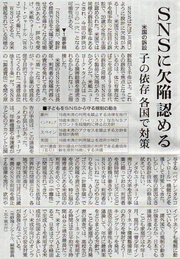 2026.3.27スタッフ注目記事 カテゴリー: ピックアップ 本日は朝日新聞朝刊から、「SNSに欠陥認める(2026年3月27日版 [51789] 3面)」の記事をオススメします. 2026年3月27日