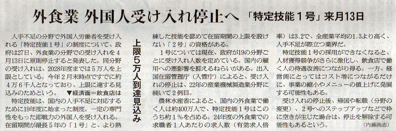 本日は朝日新聞朝刊から、「外食業 外国人受け入れ停止へ(2026年3月28日版 [51790] 3面)」の記事をオススメします.