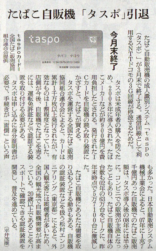 2026.3.29スタッフ注目記事 カテゴリー: ピックアップ 本日は朝日新聞朝刊から、「たばこ自販機 『タスポ』引退(2026年3月29日版 [51791] 28面)」の記事をオススメします. 2026年3月29日