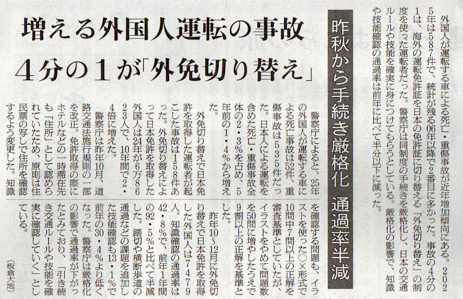 本日は朝日新聞朝刊から、「増える外国人運転の事故 – 4分の1が『外免切り替え』(2026年3月3日版 [51766] 27面)」の記事をオススメします.