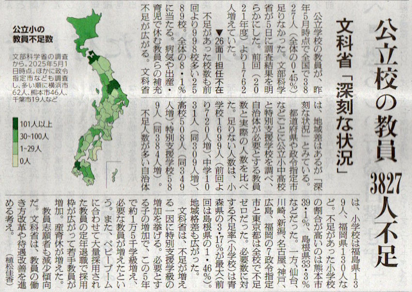 2026.3.6スタッフ注目記事 カテゴリー: ピックアップ 本日は朝日新聞朝刊から、「公立校の教員3827人不足(2026年3月6日版 [51769] 1面)」の記事をオススメします. 2026年3月6日